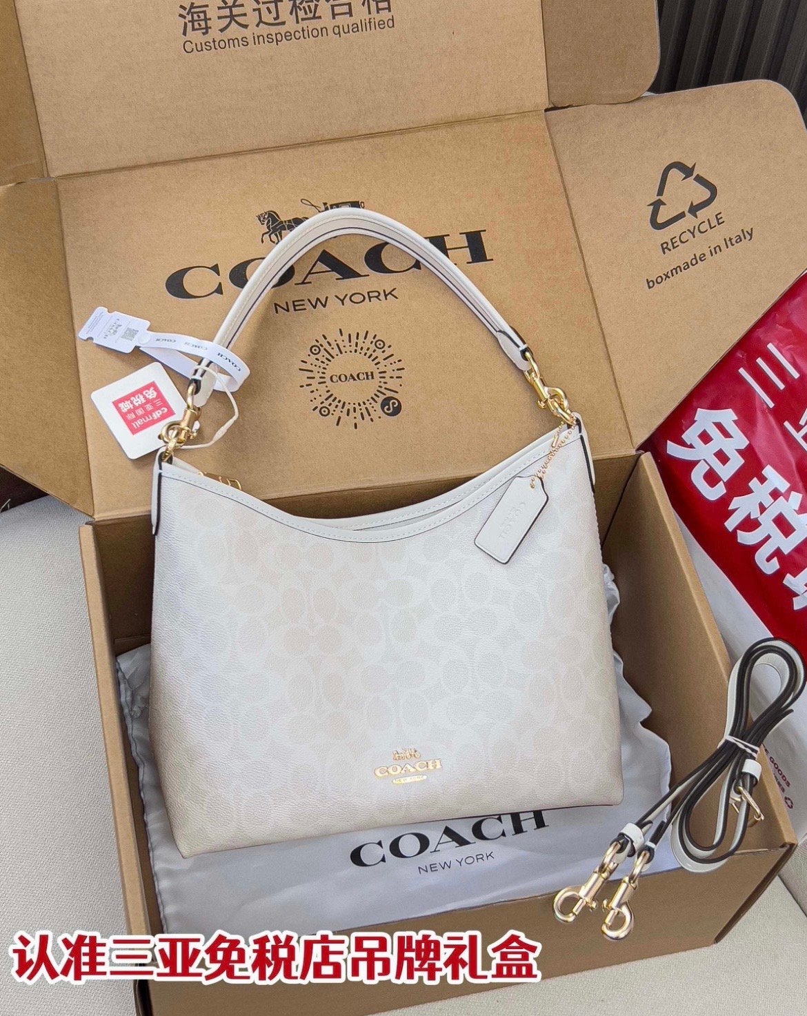 Key Features: It features the classic "C" monogram in a subtle white-on-white/cream palette. It comes with a detachable short shoulder strap and a longer crossbody strap